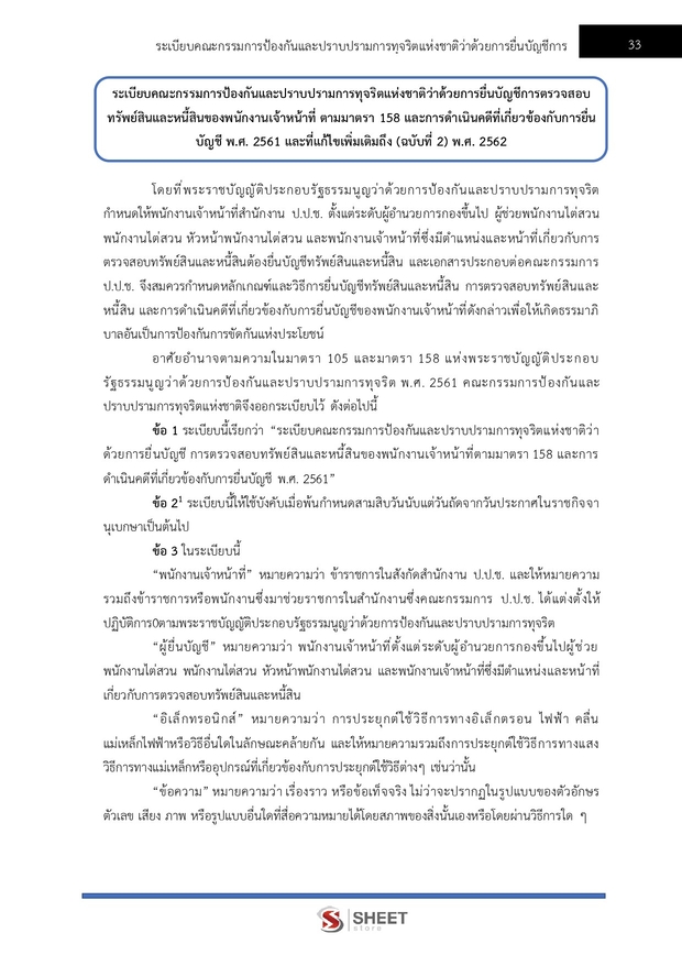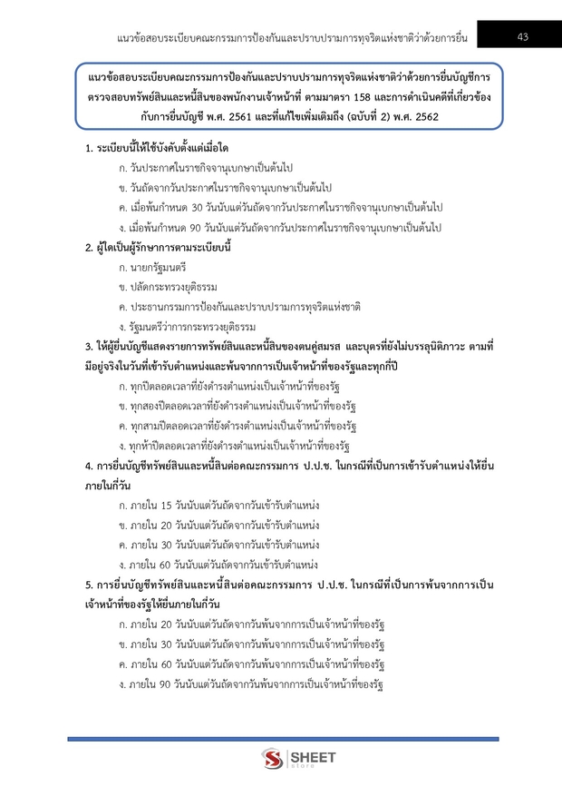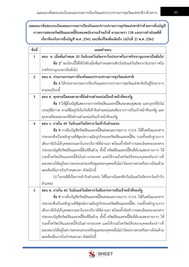 – แนวข้อสอบระเบียบคณะกรรมการป้องกันและปราบปรามการทุจริตแห่งชาติว่าด้วยการยื่นบัญชีการตรวจสอบทรัพย์สินและหนี้สินของพนักงานเจ้าหน้าที่ ตามมาตรา 158 และการดำเนินคดีที่เกี่ยวข้องกับการยื่นบัญชี พ.ศ. 2561 และที่แก้ไขเพิ่มเติมถึง (ฉบับที่ 2) พ.ศ. 2562
